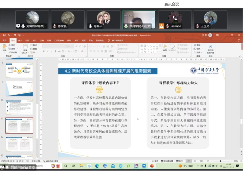 12月12日上午,太阳成集团122ccvip第十一届体育科学论文报告会在线上举行,公司邀请项立敏教授、陈文佳副教授、陈春平博士、童甜甜博士、乔智博士担任本次报告会的点评嘉宾。