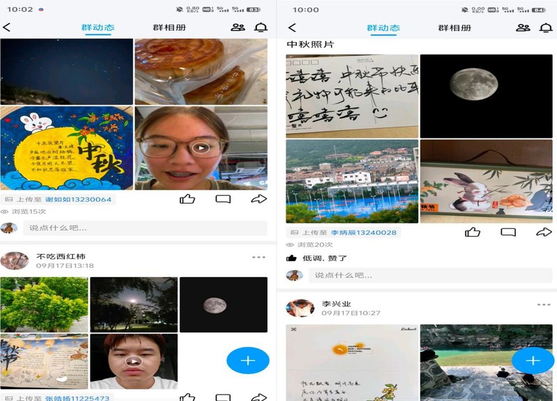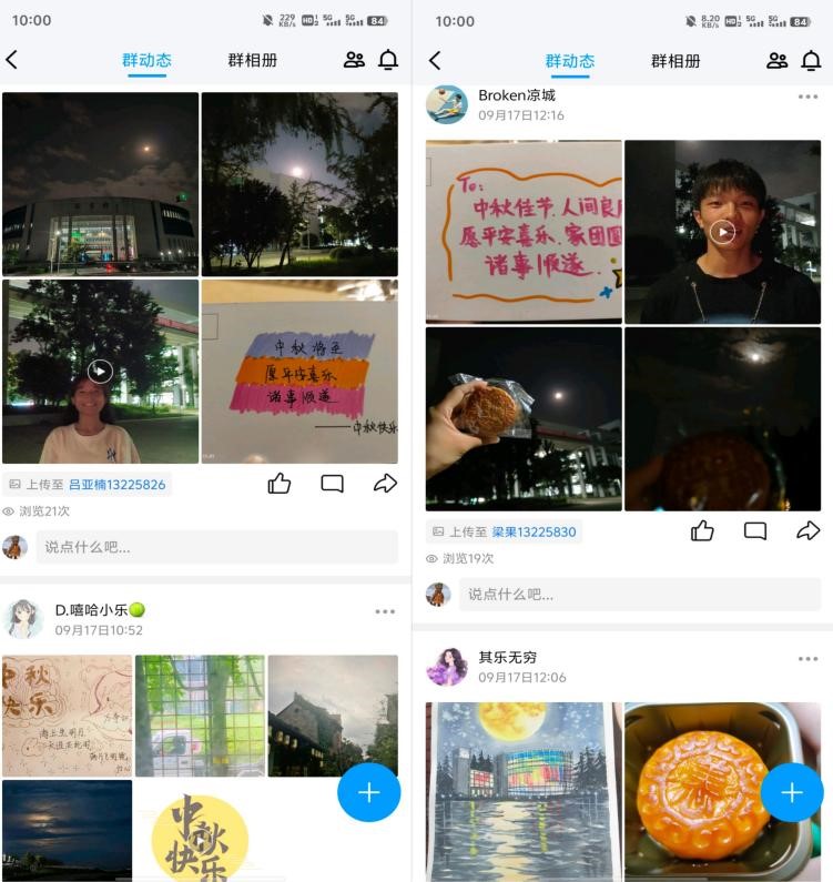 活动进行期间,同学们积极参与,提交了丰富多样的作品。回家的同学拍摄了家乡的风景照以及和家人团聚、吃团圆饭的照片,还有些同学录制了中秋祝福视频,写下对家人的思念与祝福;留校的同学则用镜头捕捉校园中秋题材的风景照,和室友一起团圆聚餐,展现了节日的喜庆与美好。这些作品不仅体现了同学们对传统文化的热爱和传承意识,也展现了他们与家人、老师和同学的深厚情感,以及对生活的热爱和积极向上的态度。