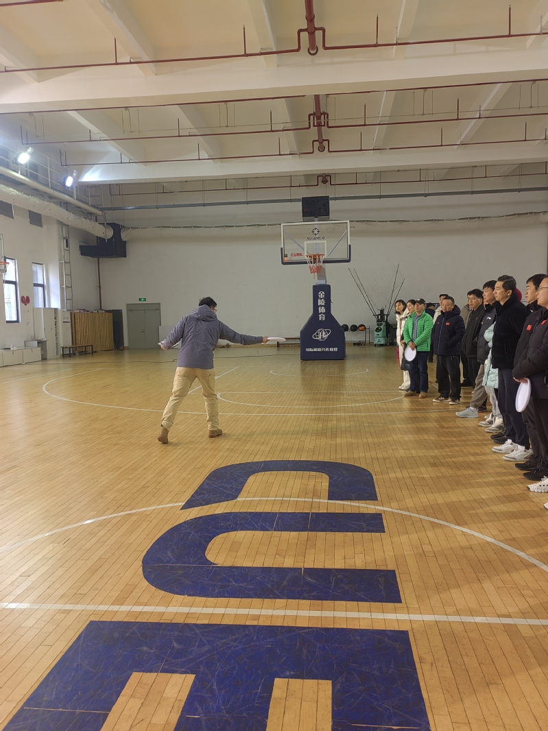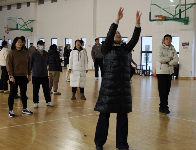 根据安排,活动分为两个环节,设置了三个项目的比赛。其中,飞盘项目以现场教学、观摩体验为形式展开。在专业人士的指导下,参加活动的老师进行了现场体验。随后,在随机分组的基础上,各组老师进行了“击鼓”、“投篮”项目的比拼。现场欢声笑语不断,加油声、助威声此起彼伏,处处洋溢着节日的欢乐氛围。