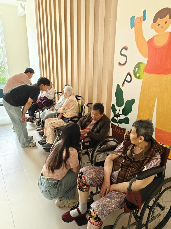 在活动现场中,志愿者们纷纷化身“贴心小棉袄”,用细致入微的陪伴传递温暖。他们围坐在老人身旁,轻轻握住老人布满皱纹的手,以拉家常的方式打开话匣子。有的老人分享起年轻时的奋斗故事,讲述在艰苦岁月里如何与命运抗争,志愿者们认真聆听,不时发出钦佩的赞叹;有的老人回忆起养育子女的艰辛,眼中泛起思念的泪花,志愿者则递上纸巾,温柔地轻拍老人后背给予安慰。面对性格内向、沉默寡言的老人,志愿者主动分享自己在校园的学习生活,从有趣的体育课程到丰富的社团活动,生动的讲述成功逗笑了原本严肃的老人。除了言语交流,志愿者们还以实际行动表达关怀。擅长按摩的同学为老人们进行肩颈、腿部按摩,一边按摩一边耐心询问力度是否合适;整个活动过程中,志愿者与老人们相谈甚欢,欢声笑语不断,浓浓的温情在空气中流淌。