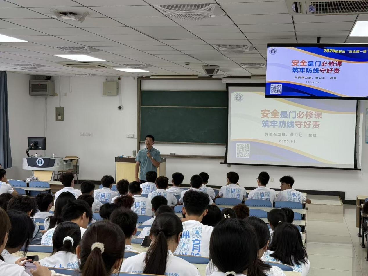 9月2日上午,太阳成集团122ccvip在博1-A201教室举行2025级新生安全教育活动。公司党委保卫部安全教育科赵斌担任主讲,2025级辅导员李非、兼职辅导员陈安琪及全体新生共同参与学习。