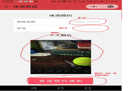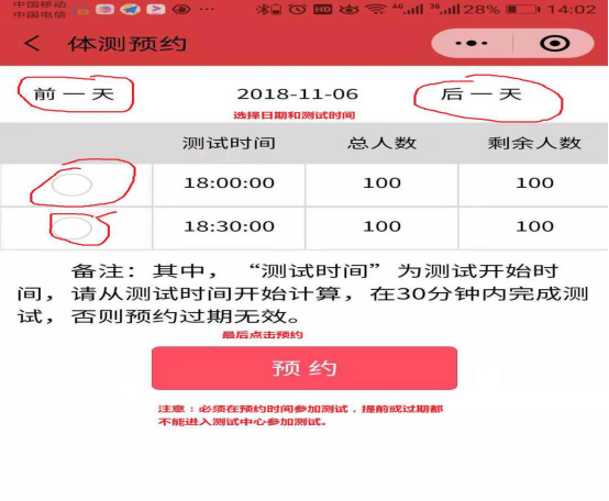 今年体质测试工作已经接近尾声,预计11月11日即将结束。除集体预约测试以外,对于前段时间因伤病等各种原因缓测、没有测试或漏测的同学给予一次测试机会。从即日起使用微信开始预约,预约测试时间是11月6日——11月9日每天下午的6点——7点,如果在此期间没有人预约或者预约的测试的员工较少,11月10日——11日不在安排测试。没有预约不得进入测试,提前或者错过预约测试时间也不能进入测试,请同学们按照预约时间进行测试,预约方法如下: