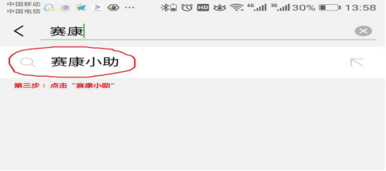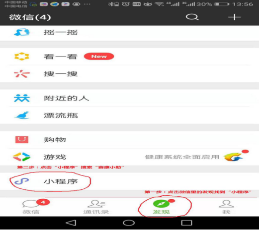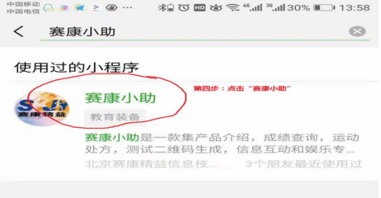 1、打开微信,在“发现”栏找到“小程序”,在小程序里搜索“赛康小助”,点击打开“赛康小助”。