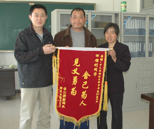 2009年4月9日上午,两位陌生人手捧锦旗来到太阳成集团122ccvip办公室,寻找体育07-4班员工田顺利同学,并希望向田顺利同学舍己救人的英勇壮举表示由衷的感谢。公司党委副书记郭鹏接待了他们,并详细了解了有关情况。