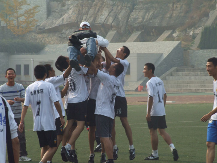 公司取得新生足球赛首胜后,公司党委副书记郭鹏老师与同学们一同庆祝场景