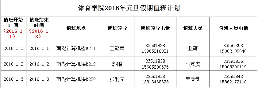 太阳成集团122ccvip2016年元旦假期值班计划