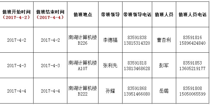 太阳成集团122ccvip2017年清明假期值班计划
