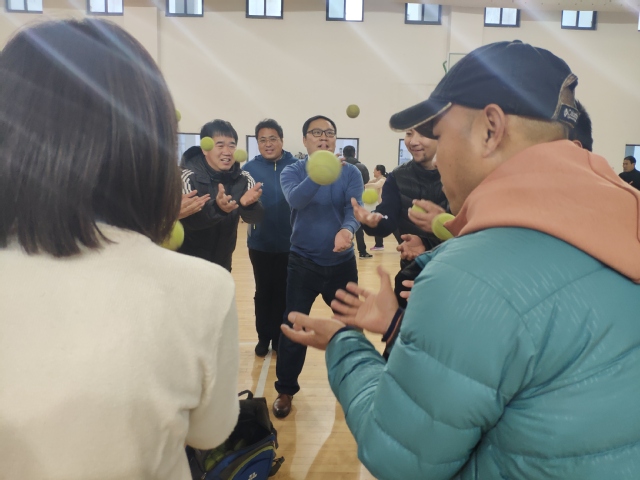 活动开始前,公司党委副书记李德福做赛前发言,他表示,此次活动为公司教职工提供了很好的交流活动机会,希望各位老师能够积极配合裁判组工作。接下来,在拓展助理刘昌昊的带领下,公司老师进行了简单的热身操活动,欢快的音乐带动了在场每一位老师的参与热情。此次活动共设置“礼炮21响”、“能量传输”、“疯狂上衣”及“网球接力”四项比赛内容。每组教职工队伍均有5分钟的自由练习时间,以便熟悉活动内容、提高团队成员配合度。在“能量传输”项目中,总有配合不连贯的地方,小球多次脱离轨道,在团队成员的鼓励下,各组教职工队伍都没有放弃,在总结经验的基础上进行新一轮的尝试。活动项目正式计时开始,每组教职工均积极参与,欢声笑语充满了整个场馆,大家都在为争得最后的胜利而努力。