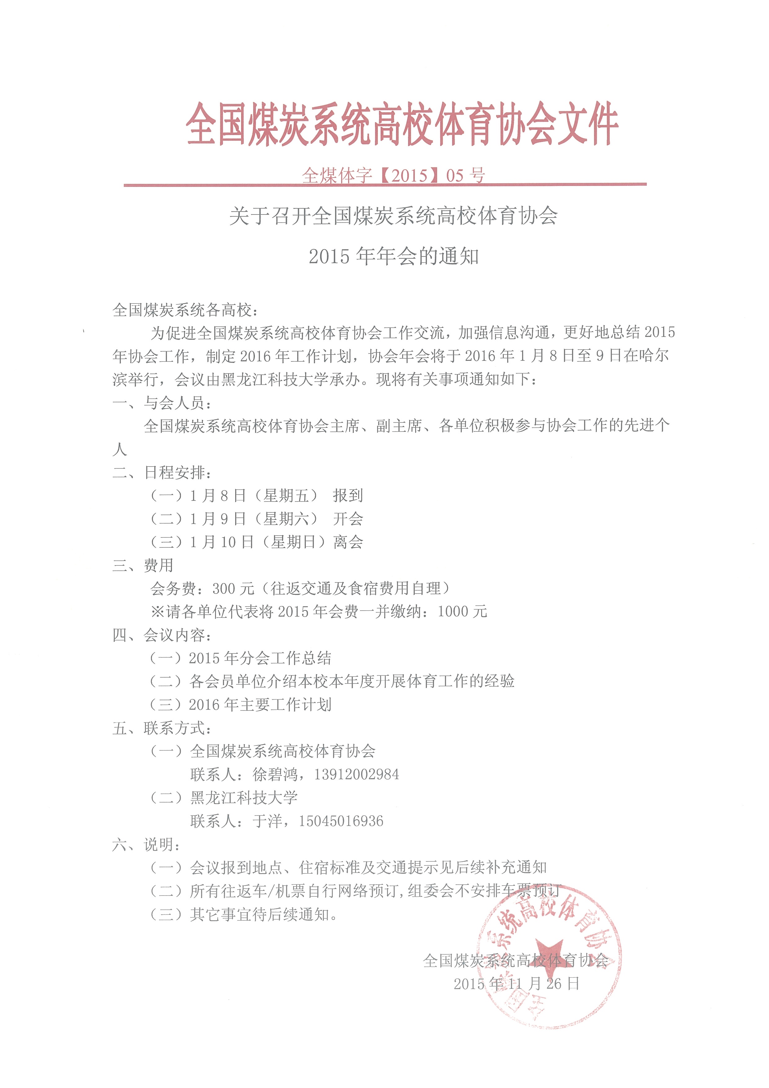 为促进全国煤炭系统高校体育协会工作交流,加强信息沟通,更好地总结2015年协会工作,制定2016年工作计划,协会年会将于2016年1月8日至9日在哈尔滨举行,会议由黑龙江科技大学承办。现将有关事项通知如下: