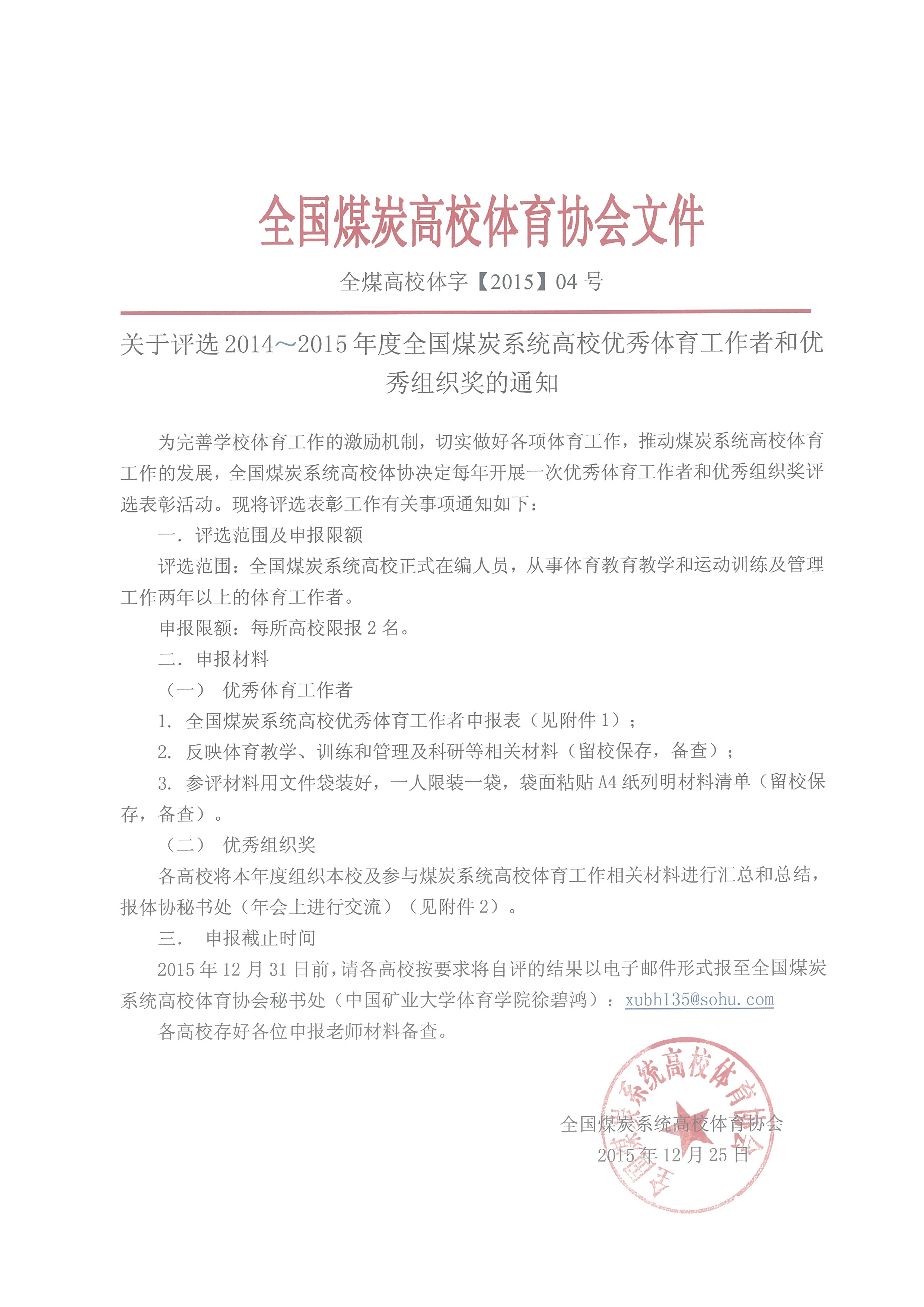 2015年12月31日前,请各高校按要求将自评的结果以电子邮件形式报至全国煤炭系统高校体育协会秘书处(太阳成集团122ccvip徐碧鸿):xubh135@sohu.com