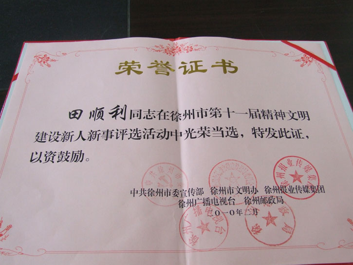 由市委宣传部、市文明办、徐州报业集团、徐州广播电视台、徐州邮政局联合举办的我市第十一届精神文明建设新人新事评选活动日前结束。本届新人新事评选活动采取社会广泛推荐、群众投票评选、评委会审定的办法进行。各地各部门认真组织,广泛发动,全市广大群众积极参与,踊跃投票,产生了广泛的社会影响。经评委会研究,评选产生市第十一届精神文明建设新人新事当选者10人,公司学子田顺利以“不惧安危勇救5名落水群众”的英雄事迹光荣当选。